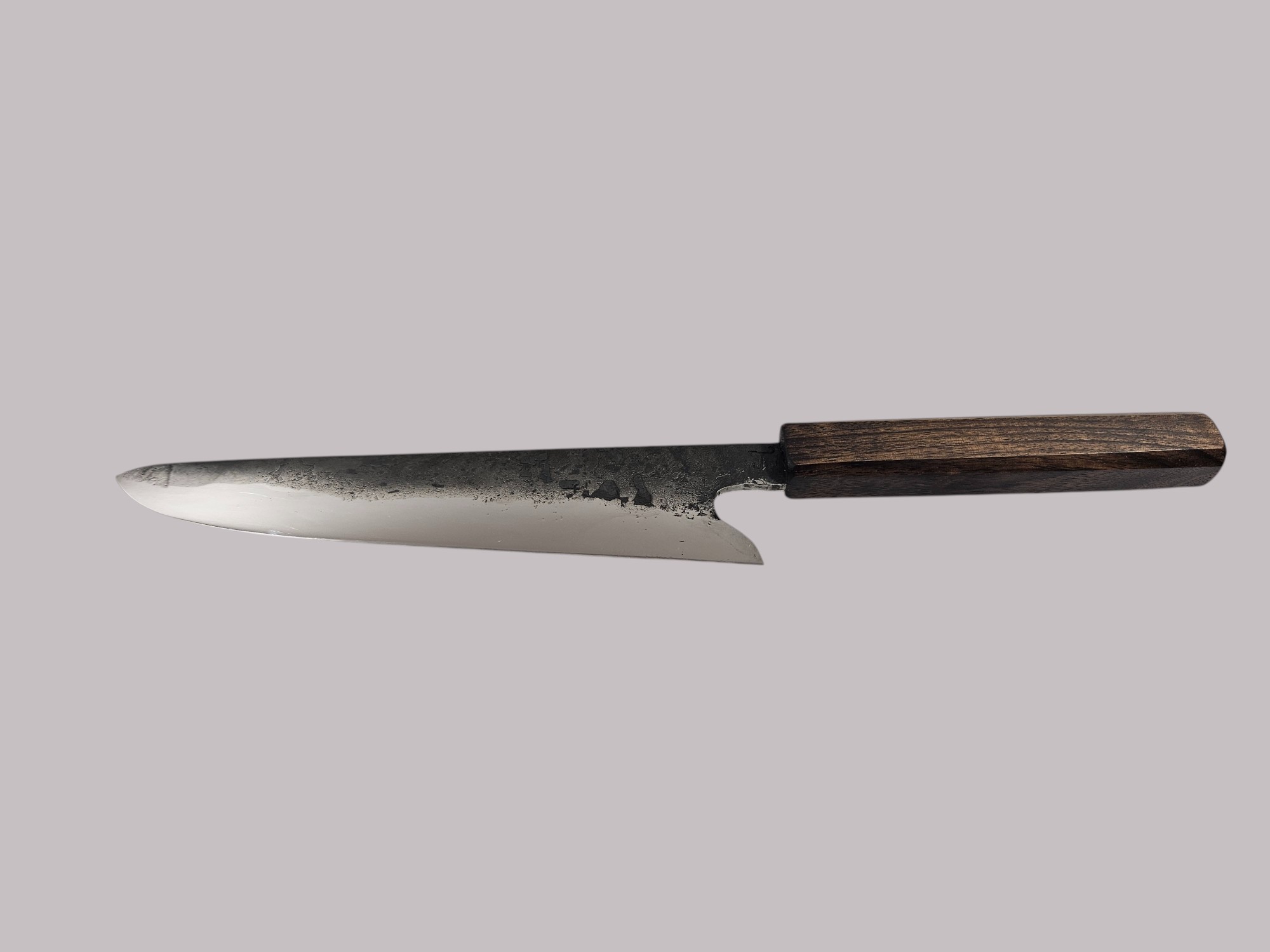hook 21 noyer Timothée Brigot | 30 septembre 2025 – Acier : 135Cr3 – longueur de lame : 210 mm – Longueur de manche : 135mm – Poignée : Noyer – Équilibrage : centré – Finition : brut de forge et poli miroir